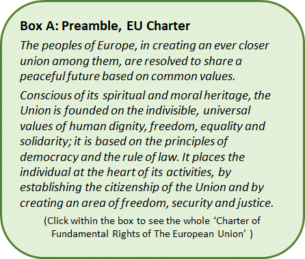 You may ask, what are the objects or conditions that are at risk regarding AI? We’ll find the answer in the Preamble of the Charter, where the two first paragraphs are shown in Box A.